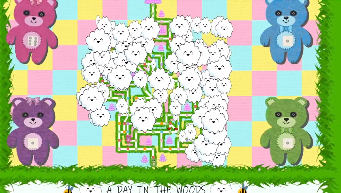 We created a map covered in clouds to attempt to add some difficulty and stop the players from planning their path, each square on the map would have a different effect such as moving back, moving forward, etc. We also added in set narrative squares which would play a part in the story of the bear’s picnic. Each one of the squares has a rhyme that plays with it. The player uses an X-box controller to control the player.