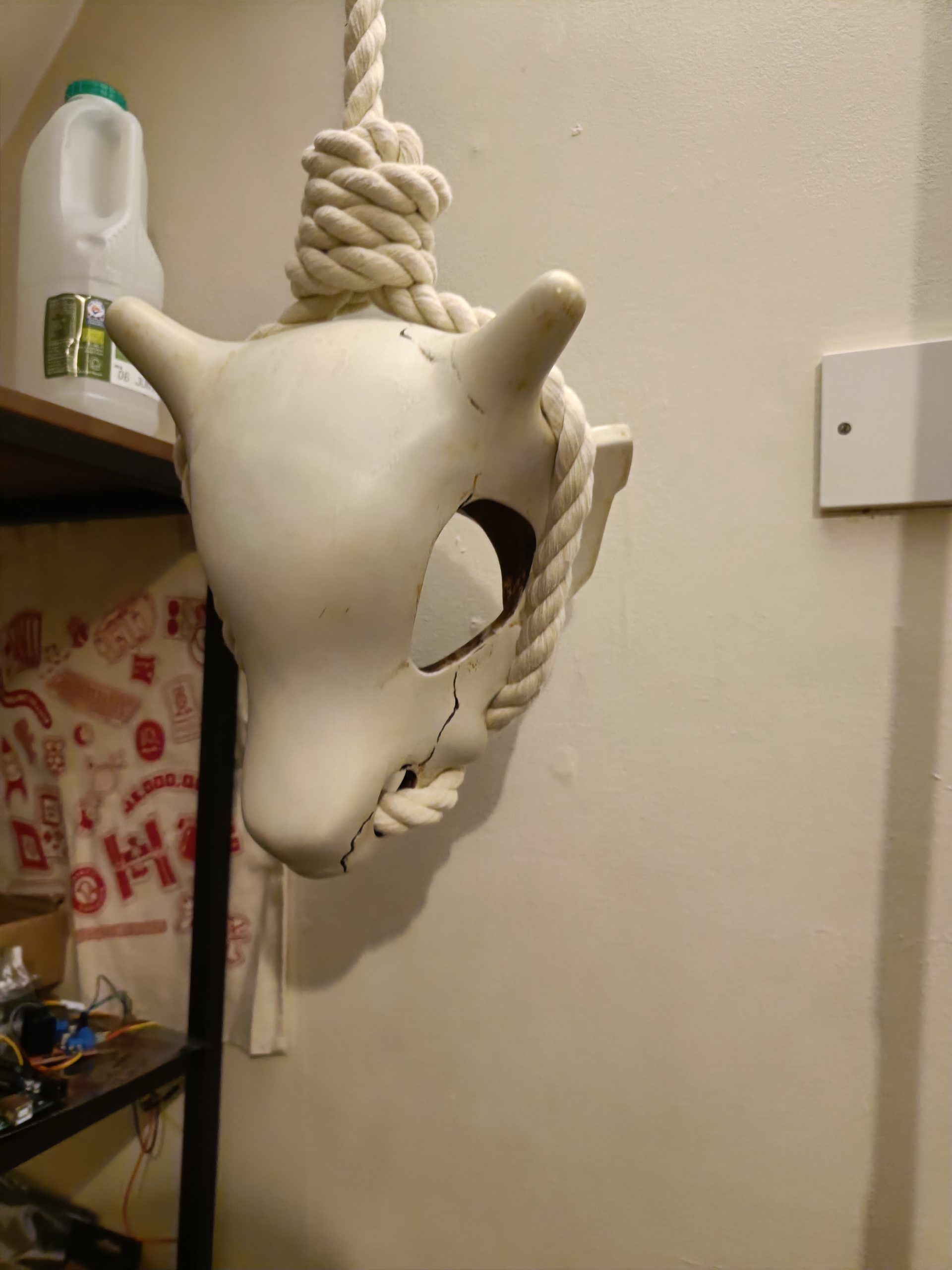 This project was a replication of a CuBone Skull from the Pokemon Cuebone. I used a 3d printer to print 4 sections and with a lot of sanding and clean up I was left with a large single piece.