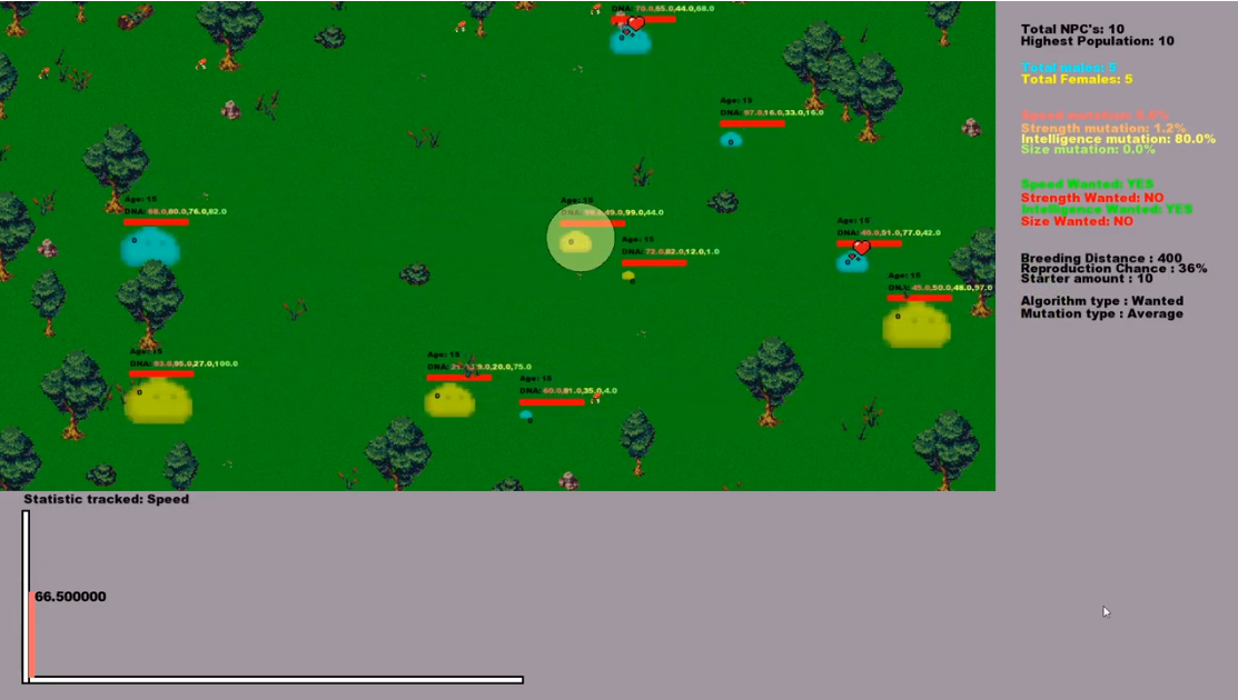 This was my final year research project for this project I wanted to look deeper into machine learning. I decided the aspect I wanted to look more into was genetic algorithms. I wanted to use a genetic algorithm, to control not just an individual but a group of NPC to achieve a goal and to be able to adapt to problems that occur.