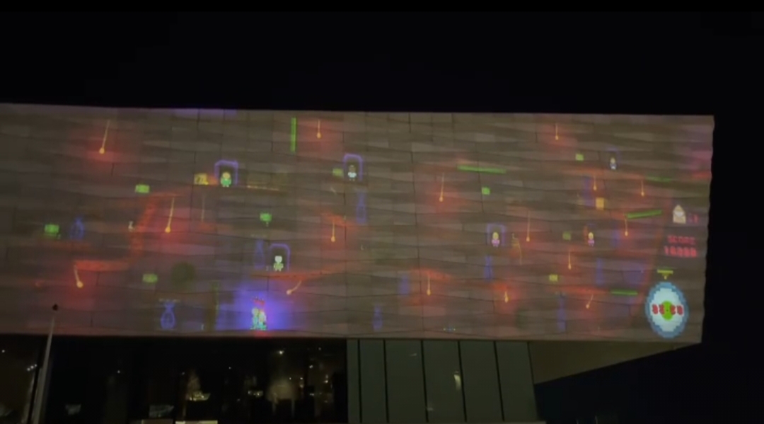 The game uses a non-contact controller in which the player moves their hands up and down to use. This made it an interesting movement system to code. Like the other Projected games, this one also relies on light and its interaction with the building and within the game itself. However, instead of using light to outline, I focused on darker areas and a single bright light to draw focus.